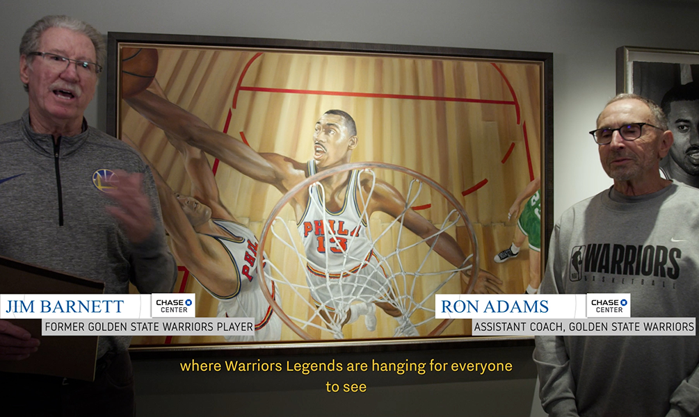 Former player and Warriors broadcaster, Jim Barnett, and current assistant coach Ron Adams take viewers on a tour of some of their favorite pieces of art at Chase Center, presented by Adobe.